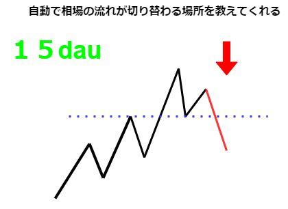 ドラゴンチャネルバンドの中央線を跨いで「15dau」で転換を示した場合そのラインでの反発を狙いENTRYをします。