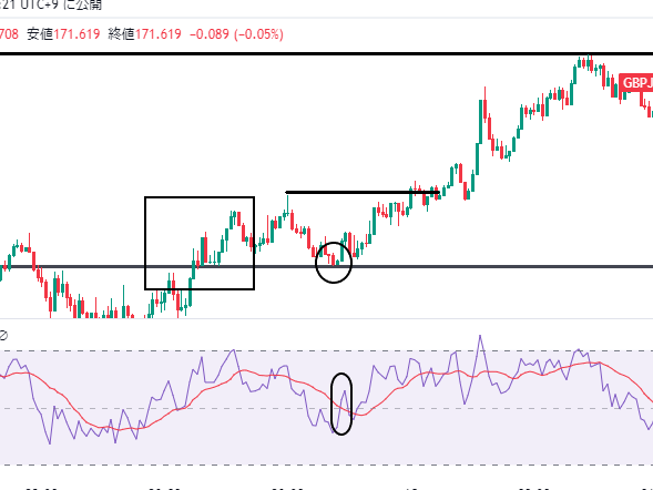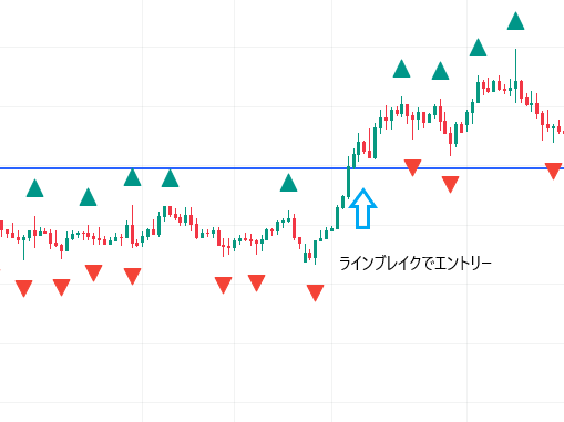 ブレイクでエントリーするタイミングは、ラインまで戻ってきた後にRSIが「50」割れから再度上昇した時にエントリーします。