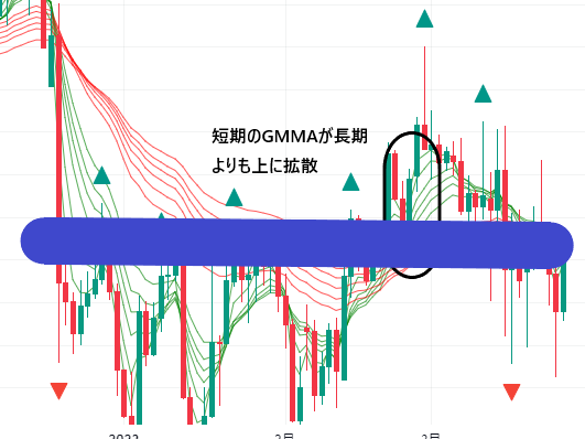 この画像はショートエントリーを説明したときの画像ですが、短期のGMMAが長期GMMAよりも上に抜けて拡散しています。
