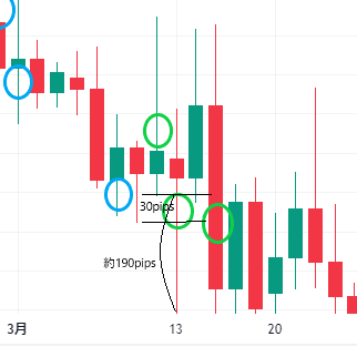 30pips下に注文を置いていても騙しになるということが理解できたかと思います。FXで勝率100%は絶対にありえないのです